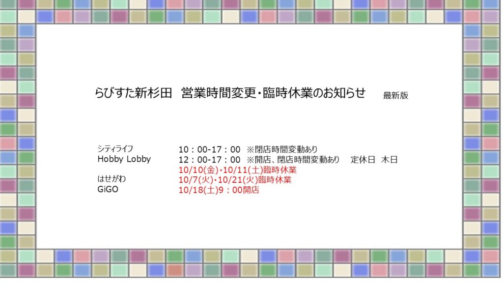 10 06 MON ショップニュース グルメ 2025.10.06 バーグ 10/7〜12おすすめ ショッピング 2025.10.04 佐々木輪業 臨時休業のお知らせ ショッピング 2025.09.29 スズキヤ 【スズキヤ新杉田店】美味しいラーメンのご紹介♪ グルメ 2025.09.28 バーグ 9/30〜10/5おすすめ ショッピング 2025.09.25 スズキヤ スズキヤ新杉田店 石川フェア グルメ 2025.09.21 バーグ 9/23〜28おすすめ グルメ 2025.09.13 バーグ 9/16〜21おすすめ ショッピング 2025.09.13 スズキヤ 9月のいちご市のご案内 MORE
