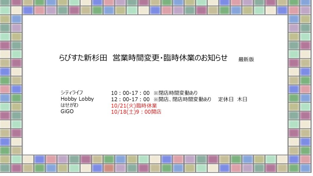 10 16 THU ショップニュース ショッピング 2025.10.15 スズキヤ スズキヤ新杉田店です グルメ 2025.10.12 バーグ 10/14〜19おすすめ ショッピング 2025.10.06 スズキヤ 秋のホットメニュー グルメ 2025.10.06 バーグ 10/7〜12おすすめ ショッピング 2025.10.04 佐々木輪業 臨時休業のお知らせ ショッピング 2025.09.29 スズキヤ 【スズキヤ新杉田店】美味しいラーメンのご紹介♪ グルメ 2025.09.28 バーグ 9/30〜10/5おすすめ ショッピング 2025.09.25 スズキヤ スズキヤ新杉田店 石川フェア MORE