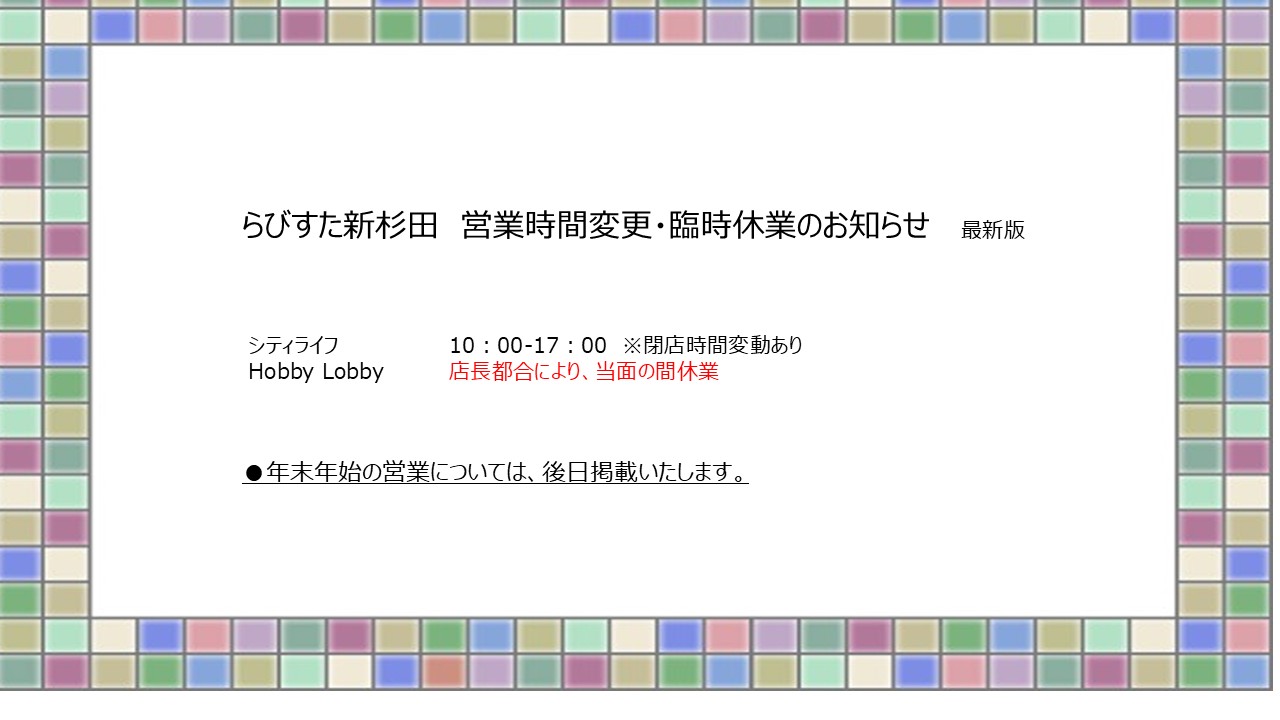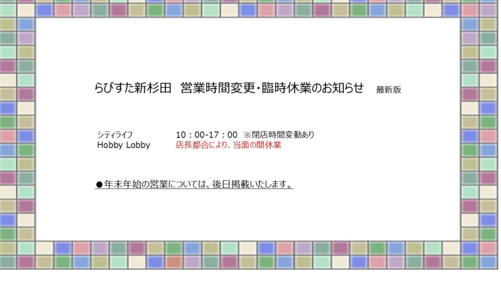 インフォメーション 2025.12.15 営業時間変更・臨時休業のお知らせ 2025.12.02 【オープン日変更】12月1日 富士林檎オープン 2025.11.20 【11/20更新】プレミアム付商品券2025について 2025.11.20 【11/20更新】らびすた商品券2025について 2025.11.07 12/1(月) らびすた新杉田歯科クリニック開院 2025.10.25 ハロウィンイベント 当日受付・チェックポイント・ゴール場所変更及びお菓子受取についてのお知らせ 2025.10.17 ハロウィンイベント事前予約終了 2025.10.08 \ハロウィンイベントを開催します/ 2025.09.29 【メディア掲載】海まちさんぽ+ 2025.08.09 \夏まつりを開催します/ MORE