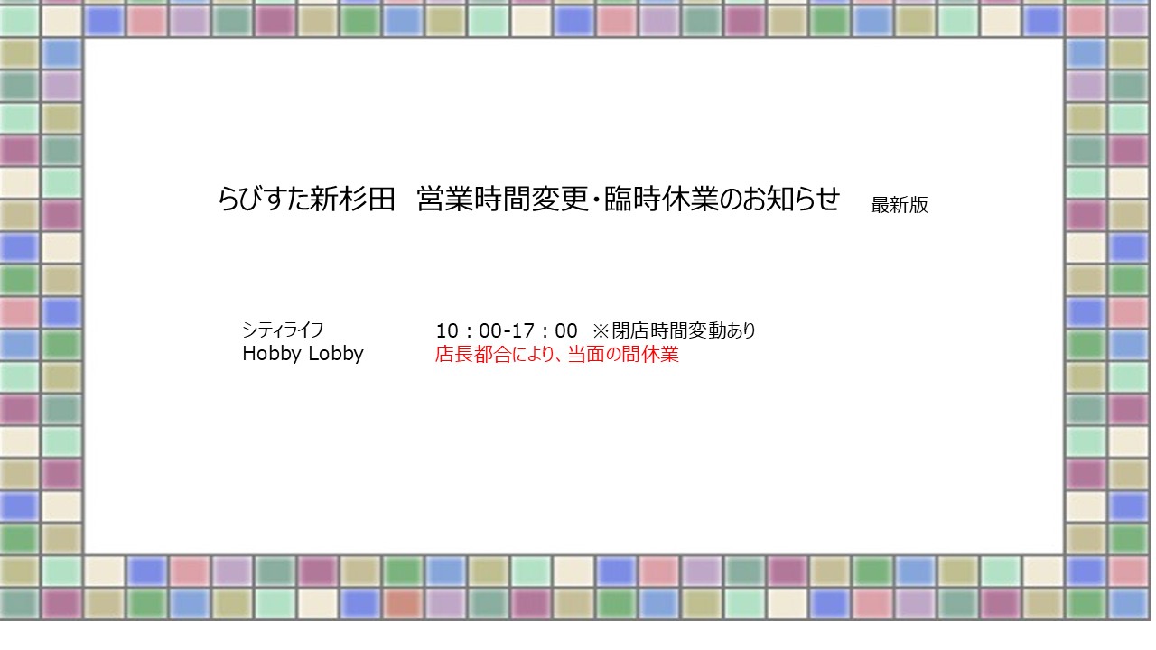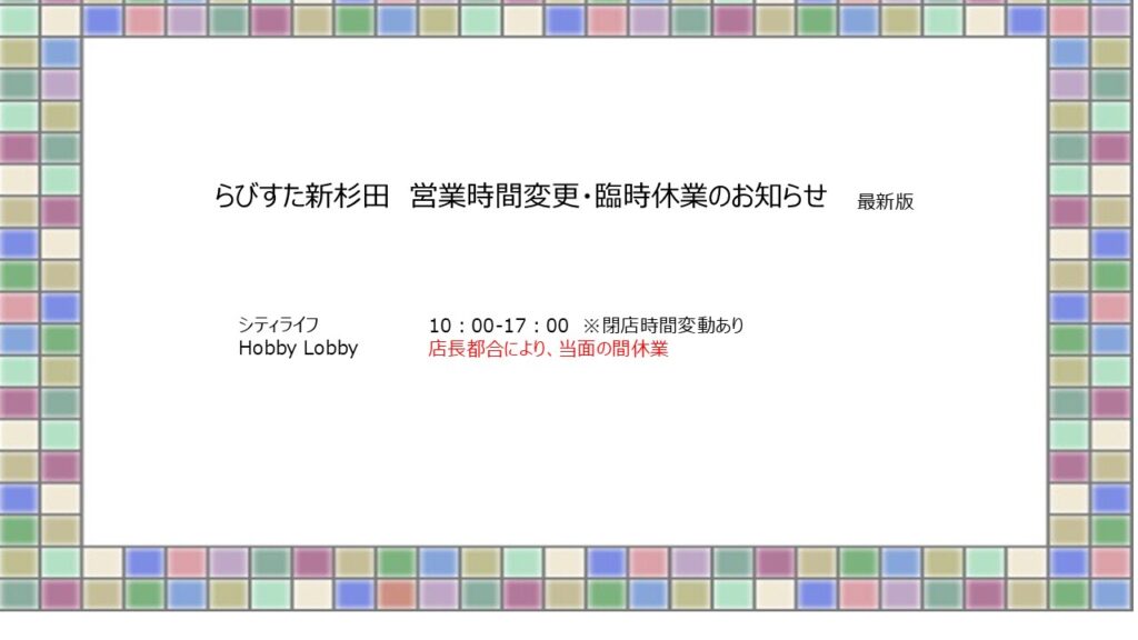インフォメーション 2026.01.12 営業時間変更・臨時休業のお知らせ 2025.12.26 \新春イベントを開催します/ 2025.12.02 【オープン日変更】12月1日 富士林檎オープン 2025.11.20 【11/20更新】プレミアム付商品券2025について 2025.11.20 【11/20更新】らびすた商品券2025について 2025.11.07 12/1(月) らびすた新杉田歯科クリニック開院 2025.10.25 ハロウィンイベント 当日受付・チェックポイント・ゴール場所変更及びお菓子受取についてのお知らせ 2025.10.17 ハロウィンイベント事前予約終了 2025.10.08 \ハロウィンイベントを開催します/ 2025.09.29 【メディア掲載】海まちさんぽ+ MORE