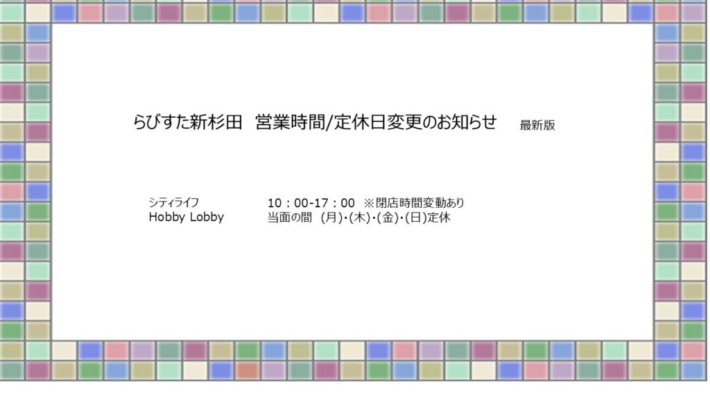インフォメーション 2026.02.16 営業時間/定休日変更のお知らせ 2026.01.21 ウィンターキャンペーン当選者発表 2026.01.17 【1/17更新】らびすた商品券2025について 2025.12.26 \新春イベントを開催します/ 2025.12.02 【オープン日変更】12月1日 富士林檎オープン 2025.11.20 【11/20更新】プレミアム付商品券2025について 2025.11.07 12/1(月) らびすた新杉田歯科クリニック開院 2025.10.25 ハロウィンイベント 当日受付・チェックポイント・ゴール場所変更及びお菓子受取についてのお知らせ 2025.10.17 ハロウィンイベント事前予約終了 2025.10.08 \ハロウィンイベントを開催します/ MORE