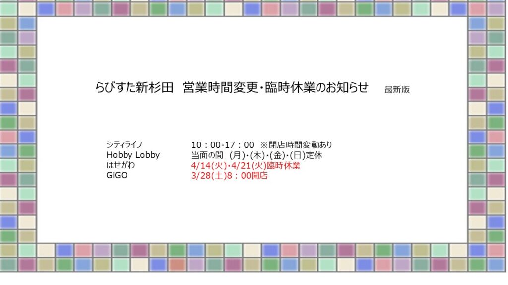 インフォメーション 2026.03.26 営業時間変更・臨時休業のお知らせ 2026.01.21 ウィンターキャンペーン当選者発表 2026.01.17 【1/17更新】らびすた商品券2025について 2025.12.26 \新春イベントを開催します/ 2025.12.02 【オープン日変更】12月1日 富士林檎オープン 2025.11.20 【11/20更新】プレミアム付商品券2025について 2025.11.07 12/1(月) らびすた新杉田歯科クリニック開院 2025.10.25 ハロウィンイベント 当日受付・チェックポイント・ゴール場所変更及びお菓子受取についてのお知らせ 2025.10.17 ハロウィンイベント事前予約終了 2025.10.08 \ハロウィンイベントを開催します/ MORE