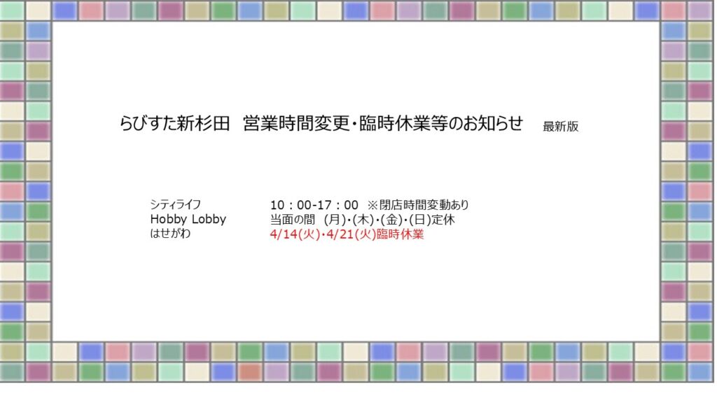 インフォメーション 2026.03.30 営業時間変更・臨時休業等のお知らせ 2026.01.21 ウィンターキャンペーン当選者発表 2026.01.17 【1/17更新】らびすた商品券2025について 2025.12.26 \新春イベントを開催します/ 2025.12.02 【オープン日変更】12月1日 富士林檎オープン 2025.11.20 【11/20更新】プレミアム付商品券2025について 2025.11.07 12/1(月) らびすた新杉田歯科クリニック開院 2025.10.25 ハロウィンイベント 当日受付・チェックポイント・ゴール場所変更及びお菓子受取についてのお知らせ 2025.10.17 ハロウィンイベント事前予約終了 2025.10.08 \ハロウィンイベントを開催します/ MORE