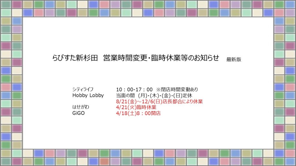 インフォメーション 2026.03.05 営業時間/定休日変更のお知らせ 2026.01.21 ウィンターキャンペーン当選者発表 2026.01.17 【1/17更新】らびすた商品券2025について 2025.12.26 \新春イベントを開催します/ 2025.12.02 【オープン日変更】12月1日 富士林檎オープン 2025.11.20 【11/20更新】プレミアム付商品券2025について 2025.11.07 12/1(月) らびすた新杉田歯科クリニック開院 2025.10.25 ハロウィンイベント 当日受付・チェックポイント・ゴール場所変更及びお菓子受取についてのお知らせ 2025.10.17 ハロウィンイベント事前予約終了 2025.10.08 \ハロウィンイベントを開催します/ MORE