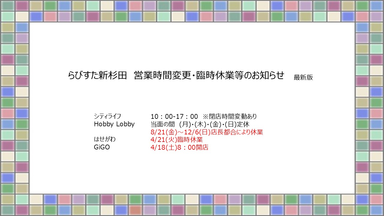 インフォメーション 2026.04.16 営業時間変更・臨時休業等のお知らせ 2026.01.21 ウィンターキャンペーン当選者発表 2026.01.17 【1/17更新】らびすた商品券2025について 2025.12.26 \新春イベントを開催します/ 2025.12.02 【オープン日変更】12月1日 富士林檎オープン 2025.11.20 【11/20更新】プレミアム付商品券2025について 2025.11.07 12/1(月) らびすた新杉田歯科クリニック開院 2025.10.25 ハロウィンイベント 当日受付・チェックポイント・ゴール場所変更及びお菓子受取についてのお知らせ 2025.10.17 ハロウィンイベント事前予約終了 2025.10.08 \ハロウィンイベントを開催します/ MORE